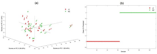 Classification of KZ and JJ based on the fluorescence EEM of tea brew. The red block represents JJ, and the green block represents KZ: (a) scores for KZ and JJ samples from PCA of fluorescence EEM data; (b) class cross-validation (CV) predicted most probable for KZ and JJ from XGBDA analysis of EEM data; no sample was misclassified.