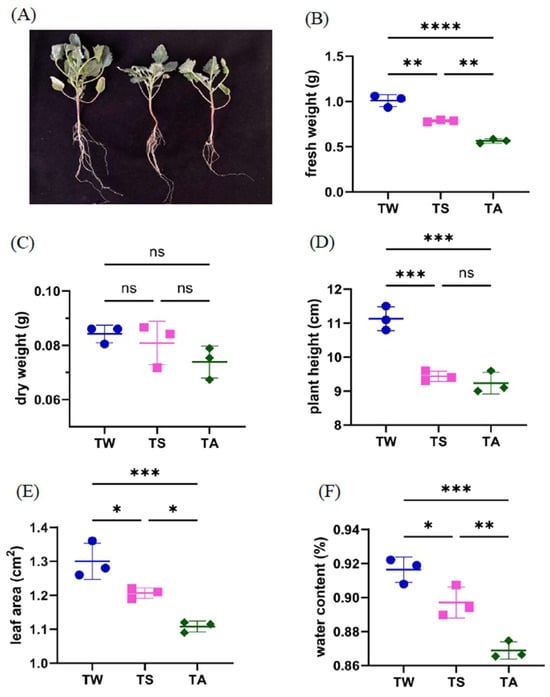 Figure 1A shows that compared with the TW, there is a decrease in the seedling height and leaf area of quinoa plants under salt stress and alkali stress. The morphological indicators of quinoa (ANOVA), including fresh weight, leaf area, and water content, decreased significantly after being subjected to salt stress and alkali stress treatments (Figure 1B,E,F), and the height of quinoa seedlings treated with salt stress decreased significantly, but the differences between stress groups were not statistically significant (Figure 1D). In addition, seedling dry weight showed the least impact (Figure 1C). Comparisons among stress groups showed that fresh weight, leaf area and water content were significantly reduced under alkali stress compared to salt stress (Figure 1B,E,F). Therefore, it can be concluded that alkali stress exerts a greater adverse effect on quinoa seedlings relative to salt stress.