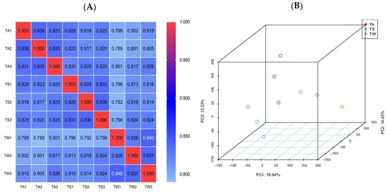 To investigate the transcriptomic response of quinoa to salt and alkali stress, we conducted transcriptome analysis on quinoa leaves subjected to these conditions. Samples were categorized into three groups: control (TW), salt stress (TS), and alkali stress (TA), each with three biological replicates. Utilizing the Illumina sequencing platform, we generated approximately 49 Gb of Clean Reads. The number of Clean Reads obtained for TW, TS, and TA were 68,570,707, 67,507,475, and 62,893,398, respectively. The quality of sequencing, indicated by Q30 bases > 93.23% and GC content ranging from 38.87% to 44.11% (Table S1), along with the comparison efficiency with the quinoa genome ranging from 94.43% to 97.85% (Table S2), was satisfactory for subsequent data analysis. Spearman’s correlation analysis showed that the correlation coefficients of the three replicates within the treatment group were all greater than 0.8, with strong reproducibility within the group (Figure 2A). Principal component analysis (PCA) showed that PC1, PC2, and PC3 explained 18.94%, 14.43%, and 12.22% of the total variance, respectively, with good sample dispersion and reliable data for transcriptome analysis (Figure 2B). Differentially expressed genes (DEGs) were identified using criteria of a fold change ≥ 2 and a false discovery rate (FDR) < 0.01.