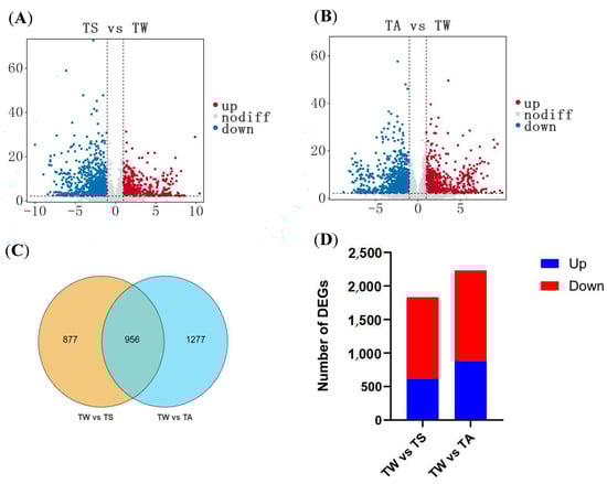 Overview of DEGs. (A) and (B) Volcano map of transcriptome genes among different treatments. TW vs. TS. Red dots, up-regulated genes; green dots, down-regulated genes; gray dots, genes with no significance. (C) Venn diagrams of DEGs among treatments. (D) Up-regulation of DEGs and down-regulation of DEGs statistics.