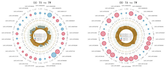 TA vs. TW detected 2233 DEGs (881 up-regulated and 1352 down-regulated) (Figure 3B,D); the top 30 up-regulated and down-regulated genes were presented in Figure 4B.