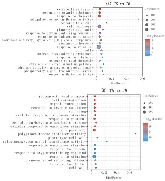 GO enrichment analysis of TA vs. TW treatments (Figure 5B) revealed enrichment with 1570 DEGs (625 up-regulated and 945 down-regulated). Among these, 458 GO terms were significantly enriched for Biological Processes (BPs), 37 GO terms were significantly enriched for Cellular Components (CCs), and 167 GO terms were significantly enriched (p < 0.05) for Molecular Functions (MFs). In Biological Process (BPs), the top three enriched terms were response to acid chemical (GO: 0001101, 154 genes), cell communication (GO: 0007154, 237 genes), and signal transduction (GO: 0007165, 212 genes). In Cell Components (CCs), the top three enriched terms were cell periphery (GO: 0071944, 419 genes), plant-type cell wall (GO: 0009505, 68 genes), and cell wall (GO: 0005618, 126 genes). In Molecular Function (MFs), the top three enriched terms were polygalacturonase inhibitor activity (GO: 0090353, 14 genes), xyloglucan: xyloglucosyl transferase activity (GO: 0016762, 18 genes), and enzyme inhibitor activity (GO: 0004857, 35 genes).