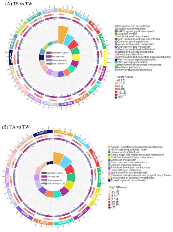 In the comparison of KEGG pathways between the TS and TA treatment groups, it was observed that the number of up-regulated DEGs was greater in TA compared to TS, while the number of annotated KEGG pathways was higher in TS than in TA. In TS, the annotated pathways included indole alkaloid biosynthesis (ko00901), glycerophospholipid metabolism (ko00564), brassinosteroid biosynthesis (ko00905), cutin, suberine, and wax biosynthesis (ko00073), and cyanoamino acid metabolism (ko00460). On the other hand, in TA, the annotated pathways were cysteine and methionine metabolism (ko00270), stilbenoid, diarylheptanoid, and gingerol biosynthesis (ko00945), and alanine, aspartate, and glutamate metabolism (ko00250).