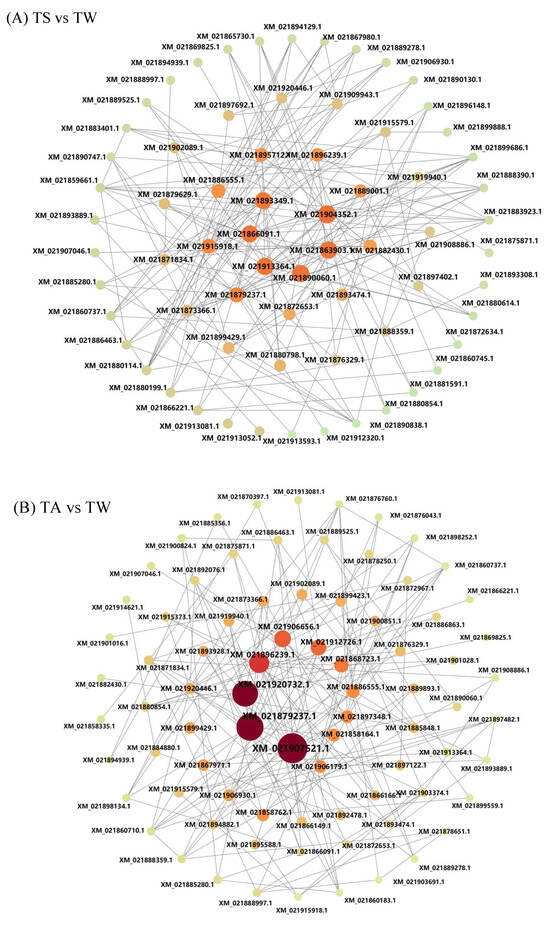 A total of 1833 DEGs (615 up-regulated and 1218 down-regulated) were detected in the comparison between TS and TW (Figure 3A,D); the top 30 up-regulated and down-regulated genes are presented in Figure 4A.