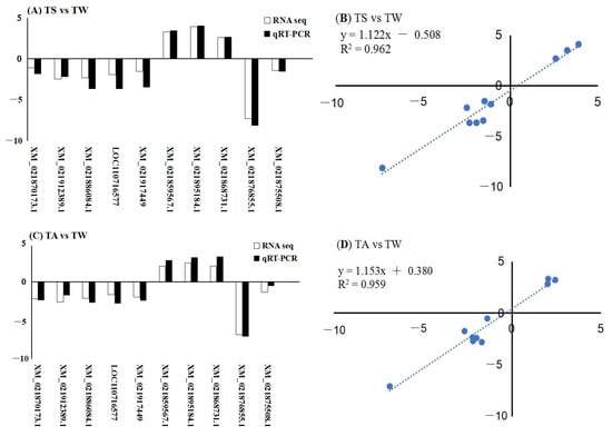 To validate the transcriptome sequencing data, we selected ten DEGs for qRT-PCR, which were common in both TS and TA, exhibited high expression, and were significantly enriched in KEGG pathways. These included three genes related to sugar metabolism (TPS, AMY, raffinose synthase), three genes for lipid metabolism (PEAMT, GPAT), three genes for hormone metabolism (AUX/IAA, PYR/PYL, WRKY), and chitinase. ACT-1 (gene56001) was used as an internal control to normalize the gene expression level. The annotation information of DEGs and the list of qRT-PCR primers are presented Table S3. The relative expression levels were transformed into log2Fold Change and compared with the RNA-Seq data. The qRT-PCR results showed a good correlation with the TS (R2 = 0.962) (Figure 8A,B) and TA (R2 = 0.959) (Figure 8C,D) of the RNA-Seq data had a strong correlation. In summary, we concluded that the RNA-seq data were reliable and could be used to genetically characterize the response of quinoa seedlings to salt-alkali treatments.