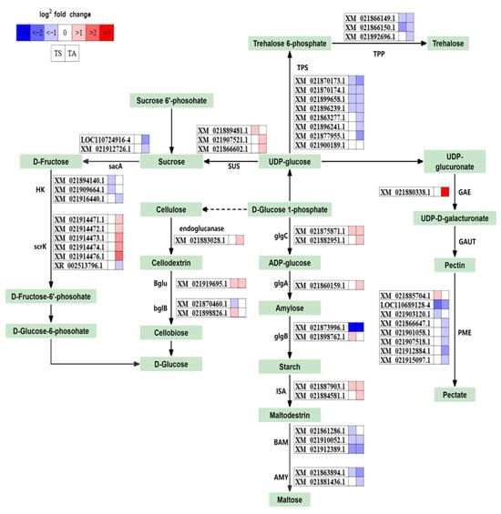 DEGs in Starch and sucrose metabolism pathway. Red blocks represent up-regulation gene expression, while blue represent down-regulation gene expression. Enzyme annotation are as follows: TPP, trehalose-phosphate phosphatase. TPS, alpha-trehalose-phosphate synthase. SUS, sucrose synthase. sacA, beta-fructofuranosidase. scrK, fructokinase-6. HK, hexokinase. ISA, isoamylase. AMY, alpha-amylase. BAM, beta-amylase. bglB, beta-glucosidase. glgB, 1,4-alpha-glucan-branching enzyme. glgC, glucose-1-phosphate adenylyltransferase. GAE, UDP-glucose 4-epimerase. GAUT, galacturonosyltransferase.