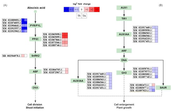 DEGs in hormone metabolism pathway. (A) ABA signal transduction pathway. (B) IAA signal transduction pathway.