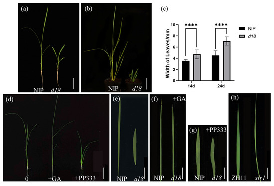 In order to explore the relationship between leaf development and GAs, we obtained a d18 mutant and an slr1 mutant. The study found that d18 showed wider leaves than NIP. This phenotype in d18 was sustained in the 14-day-old seedlings stage (Figure 1a) and the 24-day-old seedlings stage (Figure 1b,c).