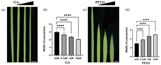 Gibberellins were negatively correlated with leaf width. (a) L3 leaf treated with GA3 for 7 days; concentrations from left to right were 0 μM, 0.1 μM, 1 μM, 10 μM, scale bar = 5 mm. (b) Statistics of leaf width of each GA treatment group (n = 15), and t-test was performed for each treatment group and control group; **** indicates highly significant differences (p-value < 0.0001). (c) The third leaf of rice treated with PP333 for 7 days; PP333 concentrations from left to right were 0 μM, 0.1 μM, 1 μM, and 10 μM; scale bar = 5 mm. (d) Statistics of leaf width of each PP333 treatment group (n = 15), and t-test was performed for each treatment group and control group; **** indicates highly significant differences (p-value < 0.0001).