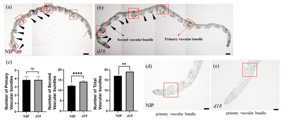 Fewer vascular bundles in d18. (a) Twelve-day-old seedlings from L3 in NIP; scale bar = 100 μm; red boxes indicate primary vascular bundles; black arrows indicate second vascular bundles. (b) Twelve-day-old seedlings from L3 in d18; scale bar = 100 μm; red boxes indicate primary vascular bundles; black arrows indicate second vascular bundles. (c) Number of primary vascular bundles, second vascular bundles, and total vascular bundles. Statistical analysis by t-test; ns indicates no significant distinction; ** indicates significant distinction, p-value < 0.01; **** indicates significant distinction, p-value < 0.0001; n = 3 in each group. (d) Red box is the primary vascular bundle in NIP; scale bar = 50 μm. (e) Red box is the primary vascular bundle in d18; scale bar = 50 μm.
