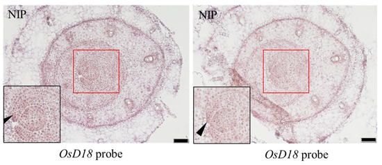 In order to explore the expression pattern of OsD18 in aboveground tissues, we performed an RNA in situ hybridization experiment. Two consecutive slices were used from 2-week-old seedling shoot meristem apical tissues of NIP. The results showed that OsD18 was highly expressed on the leaf margin (Figure 5). This result revealed that OsD18 may regulate leaf development due to control leaf margin development.