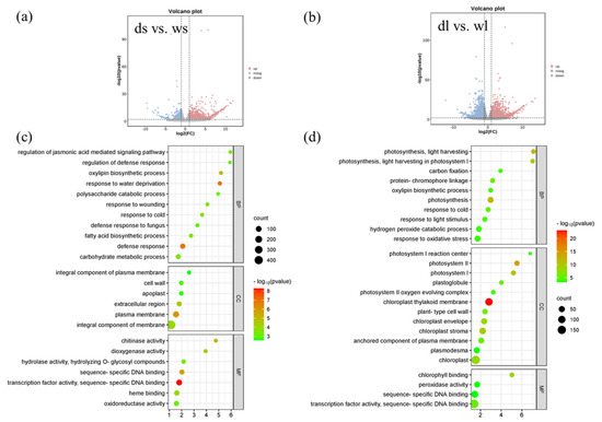 RNA-seq differential expression analysis and GO annotation enrichment analysis. (a,b) Volcanic map by DEseq2 showing the differential expression of genes between d18 and WT samples (p-value < 0.05, log2FC > 1 or log2FC < −1). Ds vs. ws, comparing d18 SAM tissue; de vs. wl, comparing d18 leaf with control leaf tissue. (c) GO-annotated enriched bubble map of differential expression genes in d18 SAM samples. (d) GO-annotated enrichment bubble map of differential expression gene in leaf samples of d18.