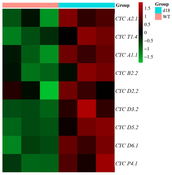 Expression profile analysis of some cell-cycle marker genes in SAM tissues. Cluster heat was drawn according to the differential expression of CYCs in d18 and wild-type SAM tissue. Red represents gene expression above the mean, green represents gene expression below the mean, and color shades indicate the degree of difference.