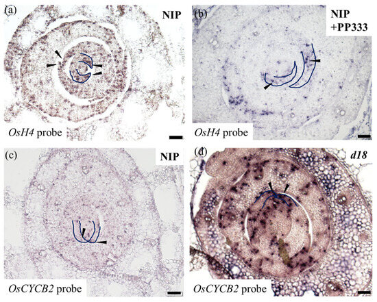 In situ hybridization to detect H4 and CYCB2 transcription in NIP and d18 SAM tissue. (a) Section of wild-type SAM tissues; OsH4 probe; scale bar = 50 μm. (b) Section of SAM tissue in PP333 treatment group; OsH4 probe; scale bar = 50 μm. (c) Section of NIP SAM tissues; OsCYCB2 probe; scale bar = 50 μm. (d) Section of d18 SAM tissues; OsCYCB2 probe; scale bar = 50 μm. Blue markers indicate leaf margin; black arrows indicate signal.
