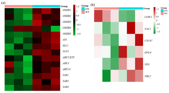 Expression profile analysis of leaf development marker genes in SAM tissues. Cluster heatmaps were generated based on the differential expression of leaf width in d18 and wild-type SAM tissue. (a) indicates marker genes for leaf-curved development; (b) indicates genes associated with leaf-width development. “d18” represents SAM tissues from d18 plants, while “WT” represents SAM tissues from wild-type plants. In the heatmap, red indicates gene expression above the mean, green indicates gene expression below the mean, and different shades of color indicate varying degrees of difference.