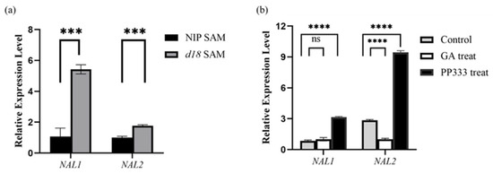 Expression level of OsNAL1 and OsNAL2. (a) The abscissa represents the two genes tested, the ordinate represents their relative expression, black represents NIP SAM tissue, gray represents d18 SAN tissue, and *** represents a highly significant difference (p < 0.0001); (b) the abscissa represents the two genes tested, the ordinate represents their relative expression, black represents the PP333 treatment group, gray represents the control group, the white box represents GA treatment group, and **** represents a highly significant difference (p < 0.0001); ns is no difference.
