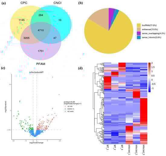 Figure 2. The lncRNAs characteristics analysis in the RKN-infected and WT. (a) The Venn diagram shows three types of software working together to identify the lncRNAs, (b) Proportion statistics of four kinds of lncRNAs, (c) Volcano plot of all DElncRNAs, (d) Heat map of all DElncRNAs.