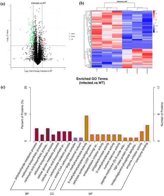 A total of 359,981 spectra were obtained from the six samples by label-free proteomics analysis, of which 42,987 unique peptides were identified. After removing the peptides with an FDR (false discovery rate) value > 1%, 7248 proteins were identified. Proteins with fold change > 1 and unadjusted significance level p < 0.05 between RKN-infected and WT were defined as DEPs. A total of 153 DEPs were obtained between RKN-infected and WT, including 52 up-regulated DEPs and 101 down-regulated DEPs (Figure 3a and Table S4). Hierarchical clustering of all the DEPs indicated that a significant difference at the proteome level between the treatment and WT was observed (Figure 3b). All the DEPs were compared with all DGEs between RKN-infected and WT by correlation analysis. A total of 8 DEPs-mRNAs pairs showed a changed abundance, of which 6 have the same trends and 2 have the opposite direction.