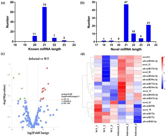 Figure 4. The miRNAs analysis in the RKN−infected and WT. (a) The number of known miRNA length, (b) The number of novel miRNA length, (c) Volcano plot of all DEmiRNAs, (d) Heat map of all DEmiRNAs.