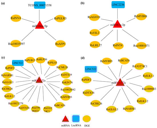 The miRNAs negatively regulated with their targeted DEGs, and targeted lncRNA were used to constructed the mRNA-lncRNA-miRNA regulatory pairs. The miR166a-5p targeted 4 DEGs, and 1 DElncRNAs (TCONS_00071558) were used to construct an interaction network (Figure 5a). The miR167a-3p targeted 6 DEGs and 1 DElncRNA (LINC2236) were performed to construct an interaction network, including RsMYB88 and RsVIN2 (Figure 5b). The miR172a targeted 18 DEGs and 1 DElncRNA (LINC522) were used to construct an interaction network (Figure 5c). A mRNA-lncRNA-miRNA regulatory network contained miR172c, targeted 11 DEGs and 1 DElncRNA (LINC522) were constructed (Figure 5d).