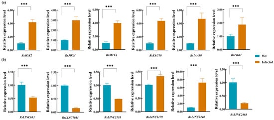 Six of the DEGs, DElncRNAs, DEPs and DEmiRNA were selected for validation by RT-qPCR, respectively. The expression level of all six DEGs (RsJOX2, RsJOX4, RsMYC1, RsSAU10, RsIAA30 and RsPRB1) were increased after RKN infection (Figure 6a). The expression levels of two DElncRNAs (RsLINC2179 and RsLINC2240) were increased, and four DElncRNAs (RsLINC633, RsLINC1084, RsLINC2138 and RsLINC2468) were decreased in response to RKN infection (Figure 6b). Compared with the WT, the three DEPs were up-regulated (RsGAPCP-1, RsH2A.2 and Rsa10037096), and the remaining three DEPs (RsJAR1, RsCLV1 and RsCIPK23) were down-regulated in the RKN-infected samples (Figure 7a). The four DEmiRNA (miRNA160c-3p, miRNA166a-5p, miRNA167a-3p and miRNA396a-3p) were up-regulated, and two DEmiRNAs (miRNA172a and miRNA172c) were down-regulated under RKN infection (Figure 7b). These results were consistent with gene expression trends from RNA-sequencing data.