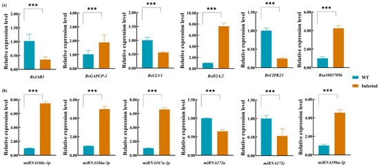 Figure 7. RT-qPCR validation of DGPs (a) and DEmiRNAs (b). t-test with p < 0.05 was use to indicate significant differences. The *** represents a significant difference.