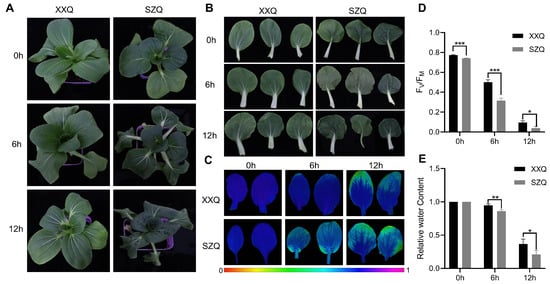 Analysis of heat tolerance of XXQ and SZQ under high-temperature treatment. (A) Phenotypes of XXQ and SZQ plants after high-temperature treatment; (B) phenotypes of XXQ and SZQ leaves after high-temperature treatment; (C) chlorophyll fluorescence images of XXQ and SZQ leaves after high-temperature treatment; (D) FV/FM of XXQ and SZQ leaves after high-temperature treatment; (E) relative water content of XXQ and SZQ leaves after high-temperature treatment. Processing temperature: 42 °C. Data are means ± SD (n = 3 biological replicates), *** p < 0.001, ** p < 0.01, * p < 0.05 (t-test).