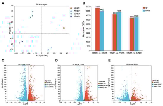 Overview of transcriptomes of XXQ and SZQ leaves in response to high-temperature treatment. (A) PCA of XXQ and SZQ transcriptomes; (B) statistical analysis of differentially expressed genes in XXQ and SZQ leaves before and after high-temperature treatment; (C) volcano plot of differentially expressed genes between XXQ and SZQ leaves before high-temperature treatment; (D) Volcano plot of differentially expressed genes of XXQ leaves before and after high-temperature treatment; (E) volcano plot of differentially expressed genes of SZQ leaves before and after high-temperature treatment. The threshold for defining differentially expressed genes is |Log2Fold Change| ≥ 1, p-value < 0.05; n = 3 biological replicates.