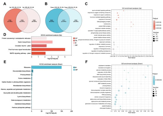 Analysis of signaling pathways regulated by high temperature specifically in XXQ. (A) Venn diagram of the up-regulated genes between XXQ and SZQ after high-temperature treatment; (B) Venn diagram of the down-regulated genes between XXQ and SZQ after high-temperature treatment; (C,D) GO and KEGG analyses of the differentially expressed genes specifically up-regulated in XXQ after high-temperature treatment; (E,F) KEGG and GO analyses of the differentially expressed genes specifically down-regulated in XXQ; data are means ± SD (n = 3 biological replicates).
