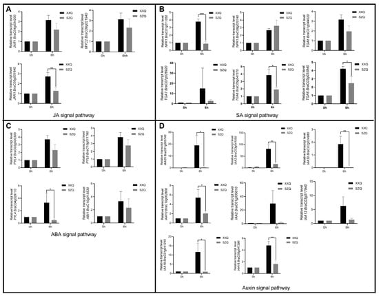 Expression profile analysis of genes in phytohormone pathways under high-temperature treatment in XXQ and SZQ. (A) Expression profile of JA signaling pathway genes under high-temperature treatment in XXQ and SZQ; (B) expression profile of SA signaling pathway genes under high-temperature treatment in XXQ and SZQ; (C) expression profile of ABA signaling pathway genes under high-temperature treatment in XXQ and SZQ; (D) expression profile of auxin signaling pathway genes under high-temperature treatment in XXQ and SZQ. Data are means of transcripts per million (TPM) ± SD (n = 3 biological replicates), *** p < 0.001, ** p < 0.01, * p < 0.05 (t-test).