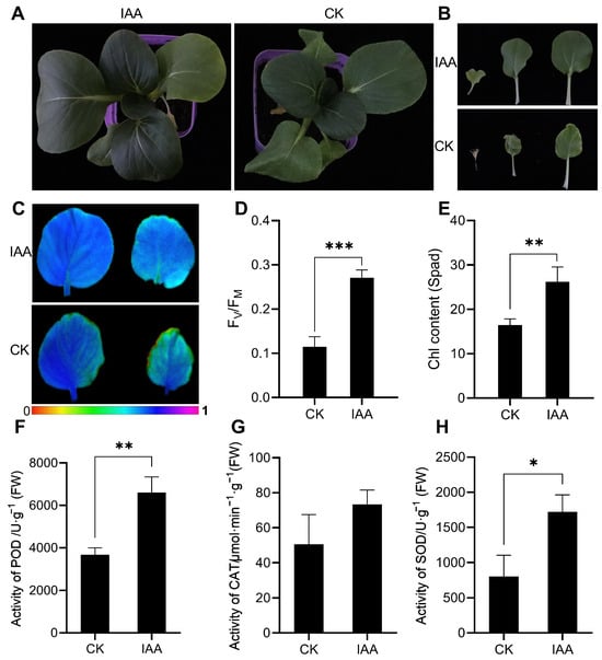 IAA induces the heat tolerance of SZQ. (A,B) Phenotypes of IAA- and water-treated SZQ plants and leaves after high-temperature treatment; (C) chlorophyll fluorescence images of IAA- and water-treated SZQ leaves after high-temperature treatment; (D) FV/FM of IAA- and water-treated SZQ after high-temperature treatment; (E) chlorophyll content of IAA- and water-treated SZQ after high-temperature treatment. (F) POD activity of IAA- and water-treated SZQ after high-temperature treatment; (G) CAT activity of IAA- and water-treated SZQ after high-temperature treatment; (H) SOD activity of IAA- and water-treated SZQ after high-temperature treatment. Processing time: 2d, temperature: 42 °C, IAA concentration: 250 μM/L. Data are means ± SD (n = 3 biological replicates), *** p < 0.001, ** p < 0.01, * p < 0.05 (t-test).