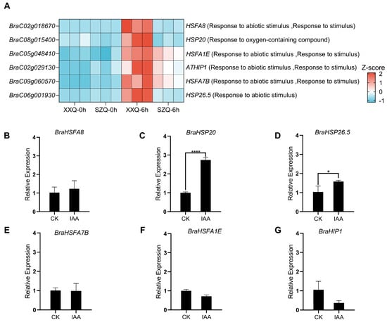 Expression patterns of HSFs/HSPs in response to high-temperature and IAA treatments. (A) Heat map of HSFs/HSPs expression, which are related with heat stress in XXQ; (B–G) qPCR result of BraHSFA8, BraHSP20, BraHSP26.5, BraHSFA7B, BraHSFA1E, and BraHIP1 expression level under IAA and water treatments; water treatment was used as a negative control. Processing time: 2d, temperature: 42 °C, IAA concentration: 250 μM/L. Data are means ± SD (n = 3 biological replicates), **** p < 0.0001, * p < 0.05 (t-test). Primers were listed in Table S2.