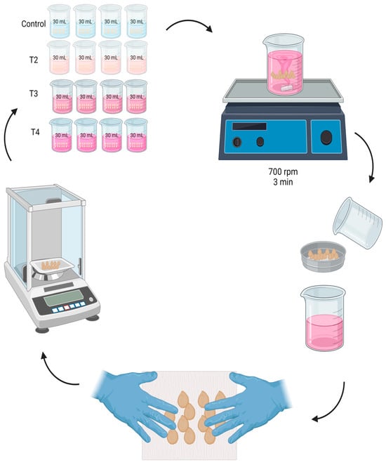 In a beaker with 30 mL of solution, 100 seeds were immersed. They were shaken in a VWR-brand magnetic mechanical shaker plate at a speed of 700 rpm for 3 min. Then, at 2, 4, 6, 8, 10, 12, 24, 36, and 48 h, respectively, the seeds were removed from the beaker where they were imbibed, using a 4 mm Labalpha-brand sieve to separate the seeds from the solution.