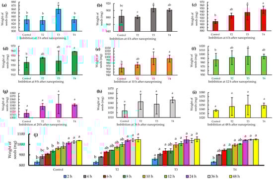(a–i) Imbibition of jalapeño pepper (Capsicum annuum L.) seeds during different time intervals (2–48 h); (j) histogram of imbibition times by treatments. Different letters indicate significant differences between treatments (Fisher’s LSD test p ≤ 0.05). Mean values ± standard error.