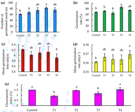 The importance of mean germination time (MGT) and mean germination rate (MGR) is highlighted in studies evaluating seed germination capacity and vigor [38]. In our study, a significant difference in mean germination time was identified between the T4 treatment and the control. The T4 treatment recorded a mean germination time of 5.91 days, significantly faster than the control, which presented the longest time with 6.21 days (Figure 5c). This indicates that T4 improves germination efficiency. No significant differences were observed between the control and the other treatments, with the exception of T4. Furthermore, when considering the mean germination rate, which is the inverse of the mean germination time, T4 stands out notably for its efficiency, accelerating germination 5% faster than the control, representing a reduction of approximately 0.3 days or 7 h (Figure 5d).