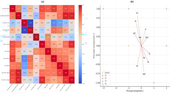 (a) Pearson’s correlation analysis represented in a heat map. (b) Principal component analysis. Both figures are made with the variables of germination and early growth, where the effect of nanopriming on seeds of jalapeño pepper (Capsicum annuum L.) can be seen.