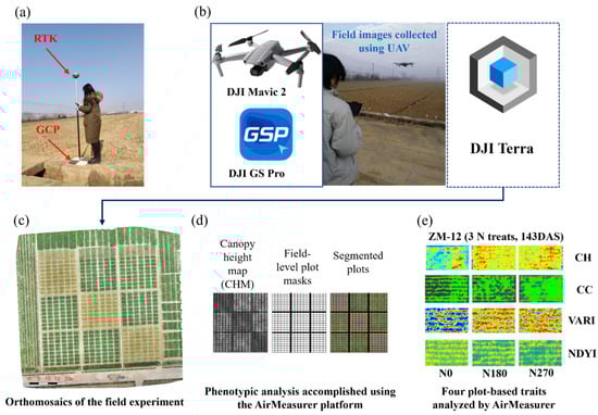 A general workflow of drone-based field phenotyping and phenotypic analysis for collection of orthomosaics, 3D point clouds, and AirMeasurer inputs and outputs. (a) RTK location of ground control points (GCPs) within the trial. (b) Trial images using a DJI Mavic 2 flying a preset DJI GS Pro protocol. Images were processed using DJI Terra. (c) A 2D orthomosaic image of the field trial. (d) 2D orthomosaic and 3D point clouds were combined for plot segmentation and trait analysis using the AirMeasurer platform. (e) Pseudo-colored images of plots showing crop height, crop cover, VARI, and NDYI at three different N-rates (N0, N180, N270).