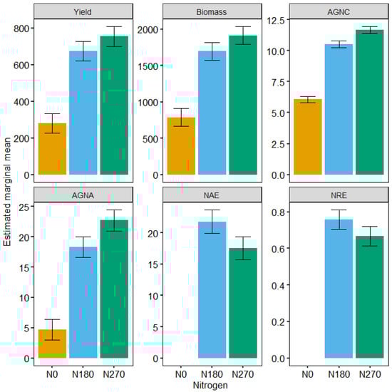 Varieties by N application interaction at three different N-rates (N0, N180, and N270). An ANOVA was applied to compare the varieties by N-application interaction at N0, N180, and N270, for the traits such as above-ground biomass (AGB), above-ground N content (ANC), above-ground N accumulations (AGNA), N agronomic use efficiency (NAE), and N recovery efficiency (NRE).