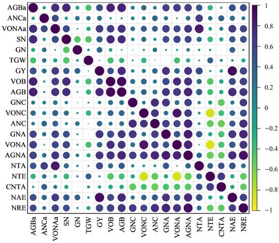 Correlation of various N-related traits. Size of circle represents the strength of the correlation with the color of the circle representing the direction of the correlation, lighter colors represent a negative correlation, darker colors represent a stronger correlation. Above-ground biomass at anthesis (AGBa), above-ground N content at anthesis (ANCa), vegetative organ N accumulation at anthesis (VONAa), spike number (SN), grain number per spike (GN), thousand grain weight (TWG), grain yield (GY), vegetative organ biomass (VOB), above-ground biomass (AGB), grain N content (GNC), vegetative organ N content (VONC), above-ground N content (ANC), grain N accumulation (GNC), vegetative organ N accumulation (VONC), above-ground N accumulation (AGNA), N translocation amount (NTA), N translocation efficiency (NTE), contribution rate of N translocation amount to grain (CNTA), N agronomic use efficiency (NAE), and N recovery efficiency (NRE).