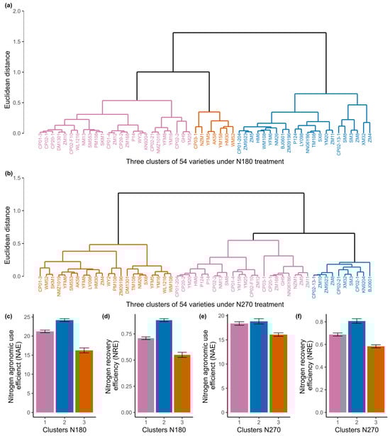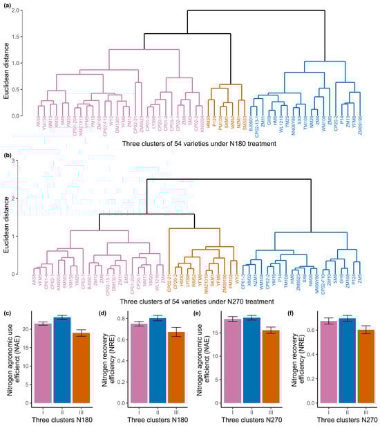 Three-cluster analysis for NUE performance based on AirMeasurer-derived target traits (canopy cover, canopy height, VARI, and NDYI) based on the 54 lines to identify high-, medium-, and low-NUE groups under (a) N180 and (b) N270 treatments. All variable measurements were standardized by the use of Z-scores. Agglomerative hierarchical clustering with Euclidean distance calculation was applied. Performance of cluster at N180 for NAE (c) and NRE (d), and at N270 for NAE (e) and NRE (f), shows that Cluster II (blue) contains the high-NUE lines at both treatments, Cluster I (pink) represents medium-NUE, and Cluster III (orange) represents low-NUE lines.