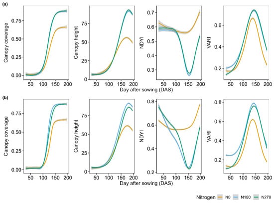 AirMeasurer-derived canopy cover, height, VARI, and NDYI development of the crop through the growing season at three N-rates (e.g., N0, N180, and N270 with three replicates across 54 varieties; colored orange, blue and green, respectively). (a) Eight plot-based measurements were used to create the growth curves for canopy cover, height, VARI, and NDYI under each N rate in the 2019–2020 season. (b) Eight plot-based measurements were used to create the curves for canopy cover, canopy height, and VARI under each N rate in the 2020–2021 season.