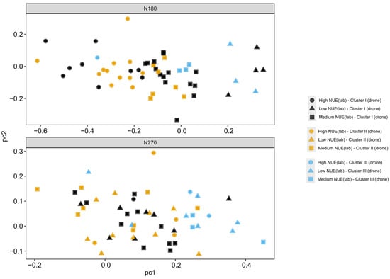 The performance of the clusters for NAE and NRE at N180 (Figure 6c,d) showed that Cluster II was the high-NUE grouping, whilst Cluster I was medium, and Cluster III was low. For N270, identifying the high-NUE cluster was more difficult with both Cluster I and II, which showed a similar NAE and NRE performance. Cluster II was marginally higher and, therefore, the high-NUE cluster (Figure 6e,f), whereas Cluster III was most likely the low-NUE cluster. To compare the cluster analysis produced from both lab- and drone-based approaches, PCs from the PCA for both N180 and N270 of NAE and NRE data were plotted (Figure 7), with circles, triangles, and squares representing high, low, and medium lab-derived data, respectively (black, orange, and blue representing the drone-derived Cluster I (medium), II (high), and III (low), respectively). At N180, Cluster II members clustered reasonably well and, crucially, some distance from all the low NUE lab-derived cluster members. At N270, the picture is more confused, with no clear clusters from either lab-derived or drone-derived methods.