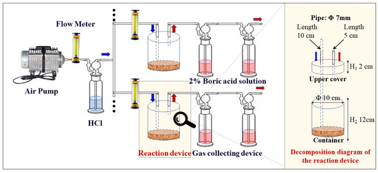 Schematic diagram of the self-assembly device for ammonia volatilization test (The blue and red arrows indicate the inflow and outflow directions of the gas respectively).