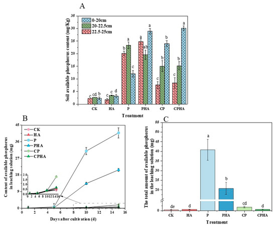 Available phosphorus content (A) in soils of different depths under various fertilization treatments, quantities of available phosphorus (B) in leachates over different cultivation days, and total amount of available phosphorus (C) in leachates after the end of cultivation. Note: The vertical axis in (C) incorporates a break within the range of 5 to 15 (inclusive) for clarity and improved visualization of data dynamics. CK, phosphorus blank control treatment; HA, humic acid application alone; P, conventional phosphorus application treatment; CP, coated diammonium phosphate treatment; PHA, conventional diammonium phosphate combined with humic acid treatment; CPHA, coated diammonium phosphate combined with humic acid treatment.