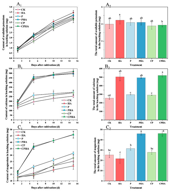 During the cultivation process, the amount of magnesium in the leachate from PHA and CPHA treatments rapidly increased on the 5th day, while the amount of magnesium in the leachate from other treatments continued to increase slowly (Figure 5C1). Throughout the entire process, the amount of magnesium in the leachate from HA, PHA, and CPHA treatments was significantly higher than that from treatments without HA addition. Compared to P, the amount of magnesium in the leachate from CP decreased by 11.6% to 29.2%. Different treatments had varying effects on the total amount of magnesium in the leachate (Figure 5C2). Specifically, the amount of magnesium in the leachate from CP treatment decreased by 11.6% compared to P treatment, while the amount from PHA and CPHA treatments increased by 46.1% and 46.7%, respectively, compared to P treatment. The amount of magnesium in the leachate from CPHA treatment increased by 65.9% compared to CP treatment, but there was no significant difference compared to PHA treatment.