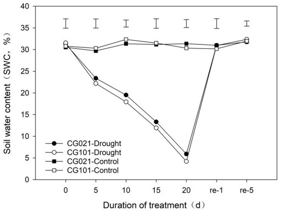 Soil water content during the experimental period. ‘CG021’ and ‘CG101’ are the drought-sensitive genotype and drought-tolerant genotype, respectively. ‘Drought’ represents the drought treatment. ‘Control’ represents the well-watered treatment. ‘re’ represents the re-watering treatment. Vertical bars indicate the LSD values for comparing the significant difference (p ≤ 0.05) between different treatments on a certain day.