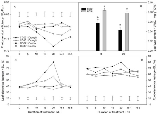 Effects of drought and re-watering on photochemical efficiency (A), leaf wax content (B), electrolyte leakage of leaf (C) and root (D) in centipedegrass. ‘CG021’ and ‘CG101’ are the drought-sensitive genotype and drought-tolerant genotype, respectively. ‘Drought’ represents the drought treatment. ‘Control’ represents the well-watered treatment. ‘re’ represents the re-watering treatment. Vertical bars indicate the LSD values for comparing the significant difference (p ≤ 0.05) between different treatments on a certain day. Different letters indicate the significant difference (p ≤ 0.05) between different treatments on a certain day. Error bars indicate standard error (SE).