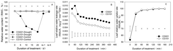 Effects of drought and re-watering on the leaf relative water content (A), leaf relative water leakage rate (B), and leaf relative water uptake rate (C) in centipedegrass. ‘CG021’ and ‘CG101’ are the drought-sensitive genotype and drought-tolerant genotype, respectively. ‘Drought’ represents the drought treatment. ‘Control’ represents the well-watered treatment. ‘re’ represents the re-watering treatment. Vertical bars indicate the LSD values for comparing the significant difference (p ≤ 0.05) between different treatments on a certain day.