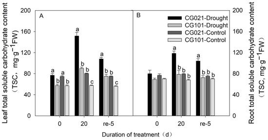 At 0 d, the TSC content in the leaves of the drought-tolerant CG101 was significantly lower than that of the drought-sensitive CG021 (Figure 6A). In the roots (Figure 6B), there were no significant differences in the TSC content between the two genotypes (Figure 6B). Drought stress led to an increase in TSC content in both the leaves and roots of the drought-sensitive CG021 after 20 d of drought stress. However, the TSC content of the drought-tolerant CG101 was significantly increased by 20 d of drought stress only in the leaves, but not in the roots. After 5 d of rehydration, the TSC content in both the leaves and roots of the drought-sensitive CG021 was still significantly higher that the control treatment. In the drought-tolerant CG101, the TSC content was significantly higher than the control only in the leaves, but not in the roots (Figure 6B).