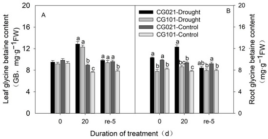 Effects of drought and re-watering on the glycine betaine content of leaf (A) and root (B) in centipedegrass. ‘CG021’ and ‘CG101’ are the drought-sensitive genotype and drought-tolerant genotype, respectively. ‘Drought’ represents the drought treatment. ‘Control’ represents the well-watered treatment. ‘re’ represents the re-watering treatment. Different letters indicate the significant difference (p ≤ 0.05) between different treatments on a certain day. Error bars indicate the standard error (SE).